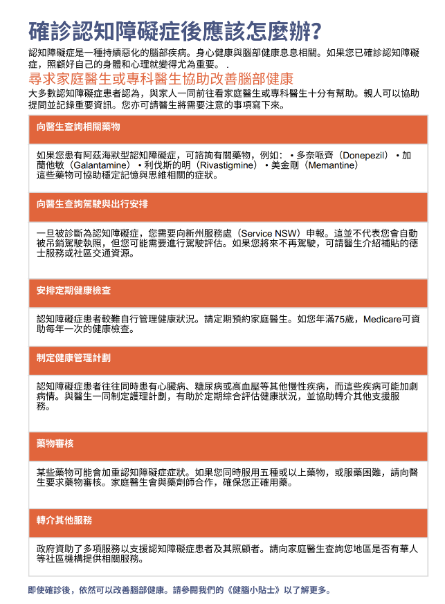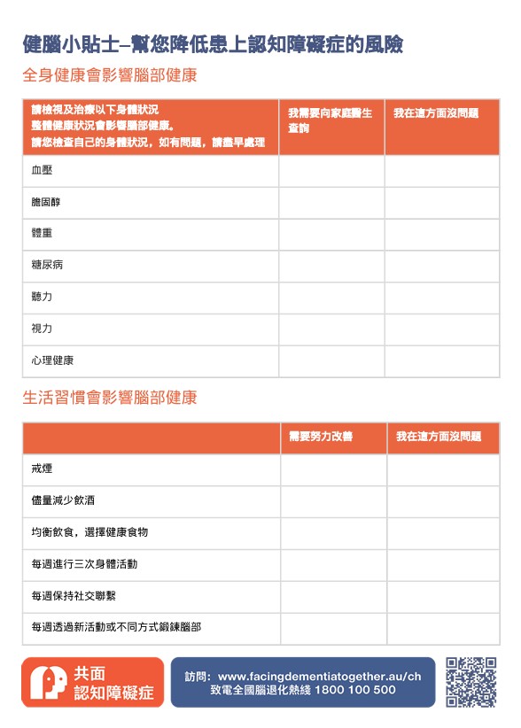 請注意,此檢查清單並非用作診斷認知障礙症或任何其他健康問題。這些變化可能亦有其他原因。